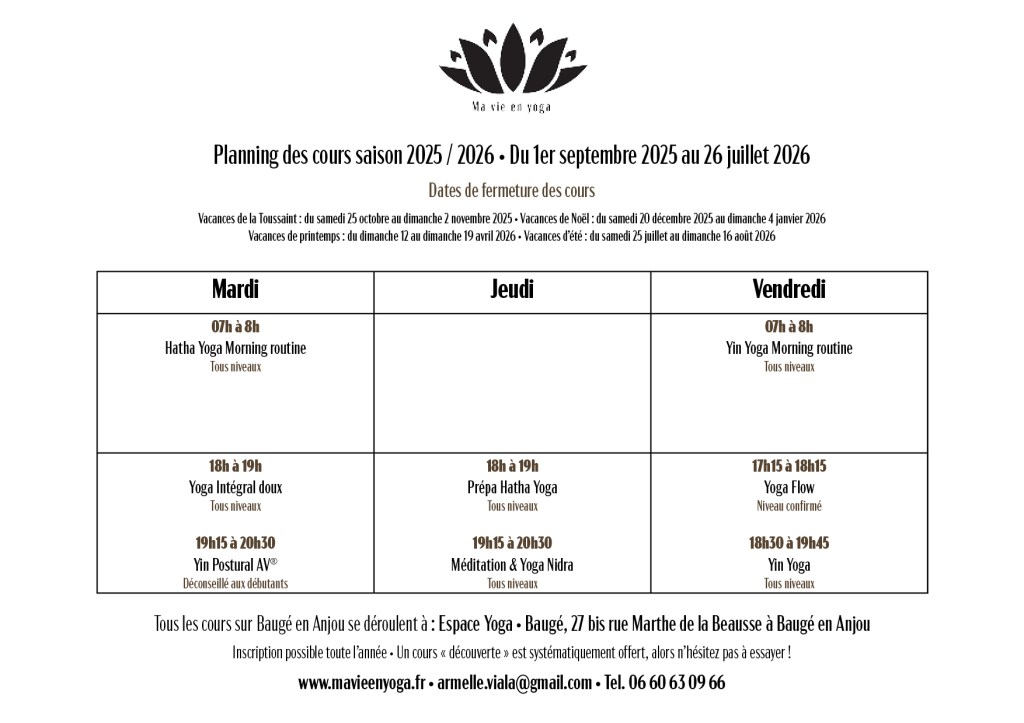Attention de bien prendre en compte les dates de modifications mensuelles du Yin Yoga de 18h30, dans le tableau ci-dessous. Je vous les rappellerai régulièrement de toutes les façons.